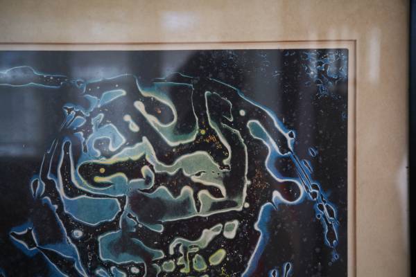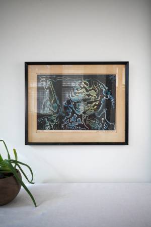 Vintage modern abstract artwork from the 1970s signed in pencil by American abstract artist and printmaker John Blair Mitchell and titled "First State". Framed in black wood frame and mounted behind glass. Excellent vintage condition.