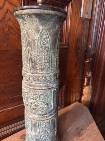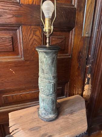 Vintage patina cast metal lamp is in good shape. This has a wooden base with a brass switch. The lamp measures 6” diameter 30” tall. 2 available.