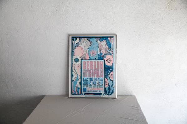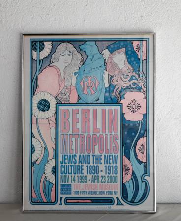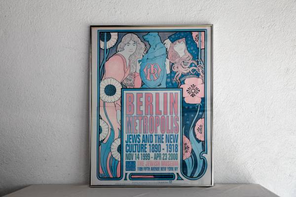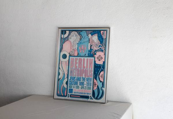 Cool vintage poster for a 1999 show at the Jewish Museum in New York called "Berlin Metropolis." Great Art Nouveau design in pinks and blues. Mounted behind glass in a black metal frame. Excellent vintage condition.