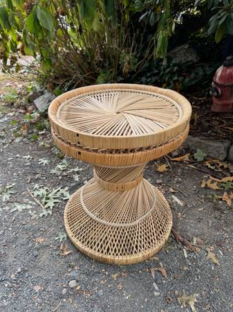 Vintage Rattan hourglass side table is in great shape. This can be used as is or add a top of your choice to it. This measures 16” round x 19” tall and 13.5” round for glass insert.