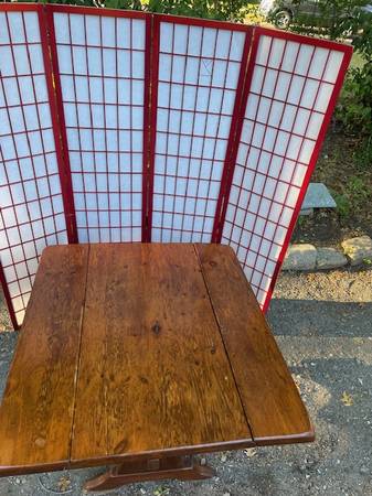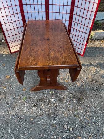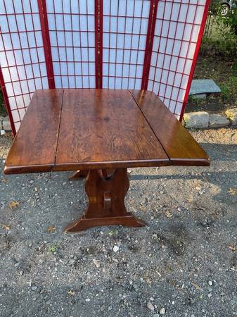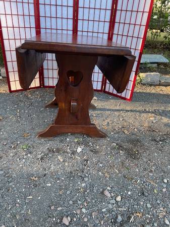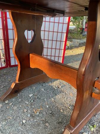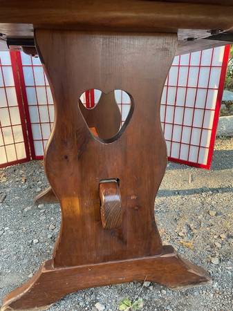 Vintage solid dark pine country farm house drop leaf trestle dining table is in good shape. This table can be completely stripped down and refinished to be lighter or darker or even a painted finish. This has a cute heart shaped cut into the trestle and this comes completely apart for easy moving and refinishing. This measures 44”L x 23”w x 30”h with the two leaves being 9” making the table 40” x 42”.
