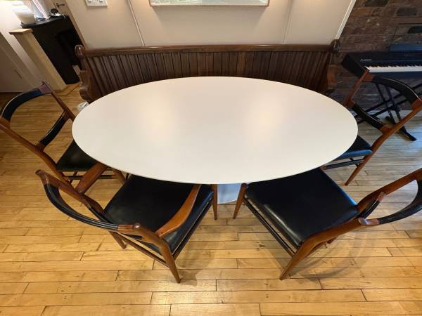 Set of 4 handsome dining chairs in the style of Danish designer Arne Jacobsen. One armchair, three side chairs. Vintage condition, normal wear given age. Strapping restored 4 years ago. Width: 21.5”...