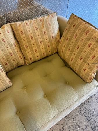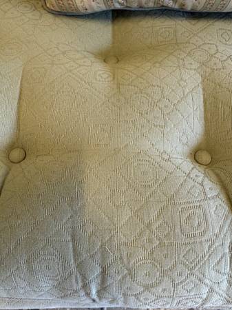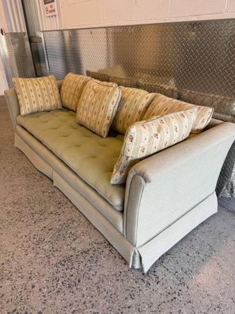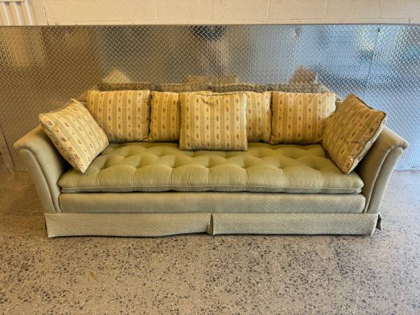 Vintage upholstered tufted sofa with throw back pillows is in good shape. This sofa was reupholstered 20 years ago and has some slight fading in certain areas due to sun. The back pillows can be replaced with other pillows to create a different look. This measures 87” long 33” deep 26” tall, 16” seat height.