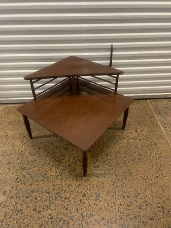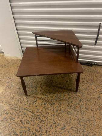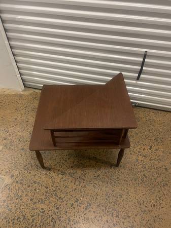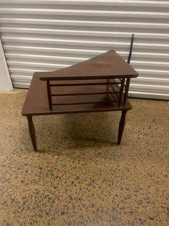 Vintage walnut laminate mid century modern corner side table is in good shape. This is made of MDF with a laminated top to look like walnut. This can be used as is or have it painted. This measures 28”sq x 23”h.