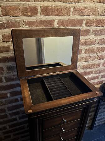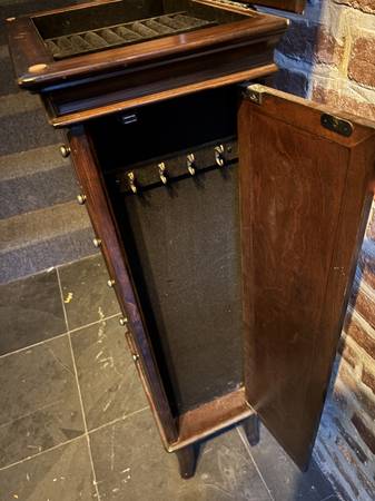 Vintage wooden standing jewelry chest that features 6 drawers and 2 side panels for longer necklaces. Excellent for storage!