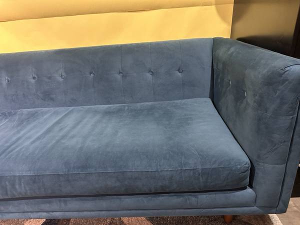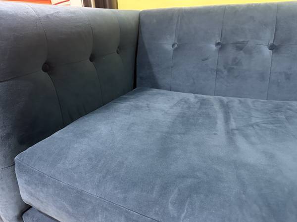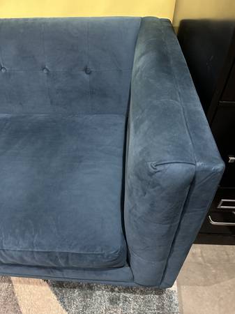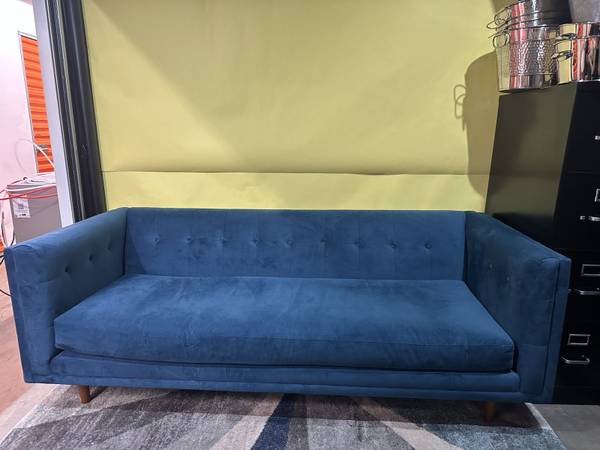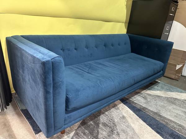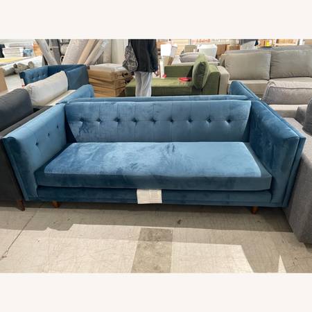 For sale: West Elm Bradford Blue Velvet Sofa. Mid-century modern style sofa with tufted back. Excellent condition. Brand: West Elm Collection: Bradford Overall Couch Dimensions: Width: 82 inches,...