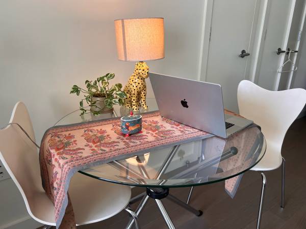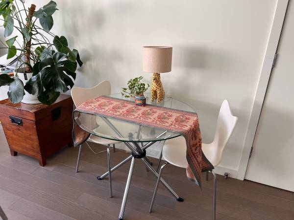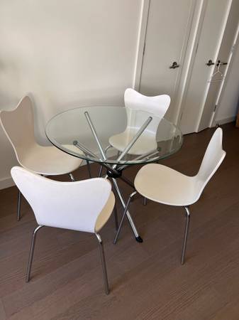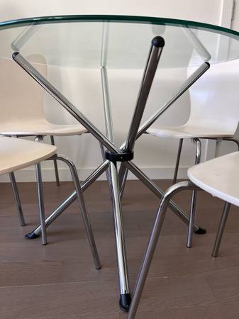 West Elm Dining Table and Chairs (4). Table and chairs in good condition with minor scratches on glass that are not noticeable.
