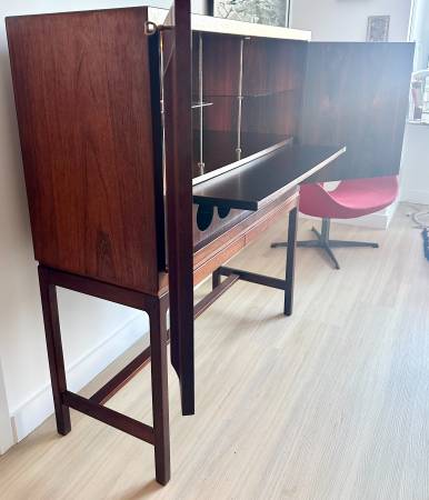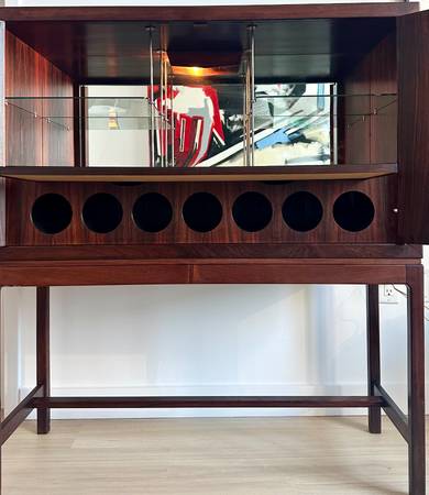 True mid-century modern Scandinavian high-end craftsmanship. It is made of the most beautiful rosewood and has nice brass details, the interior light turns on when the doors are opened. Inside the bar cabinet there is space for liquors, wines, glasses and utensils. Additional bottles can be placed at the bottom. Because of the mirror and built-in light, this is all presented in a chic manner. A shelf can be pulled out for easily making your drinks at the cabinet.