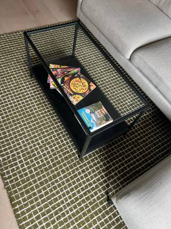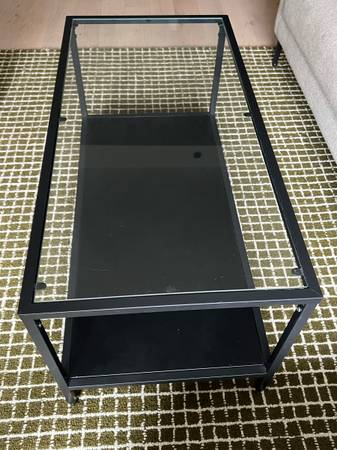Glass coffee table with black metal frame and bottom shelf