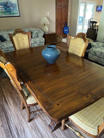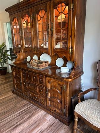 Twin pedestal style table with 2 leaves and a two piece hutch.