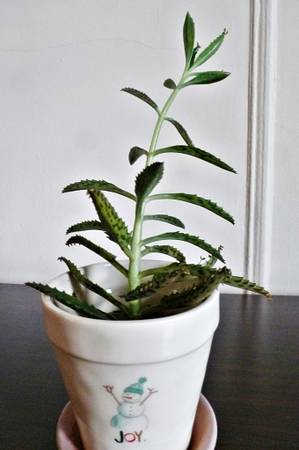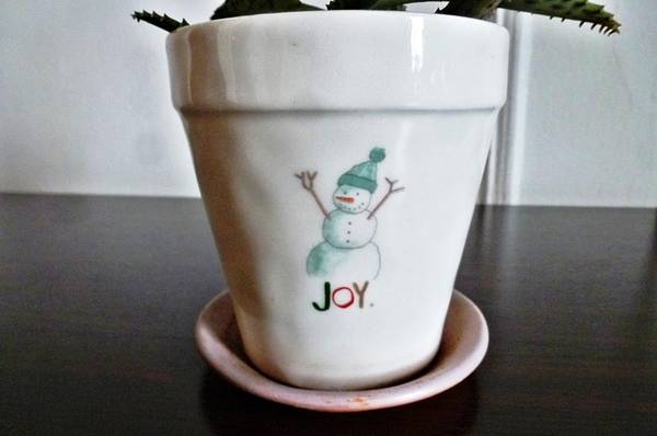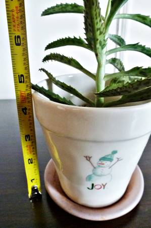 An adorable and healthy mother of thousands plant in white ceramic pot with a cute snowman graphic and the word 'Joy'. It is currently about 11" tall and fast growing. The plant pot is about 4.5" high and over 4.25" in diameter across. Let this evergreen cutie bring some joy to your home especially during the colder months. As now is growing season, it will grow fast and some plantlets are already showing up and growing. Makes a beautiful gift too for someone special!