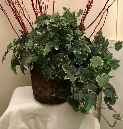 The arrangement seen in the third photo consists of two ivy bundles combined with decorative branches, a basket and straw. (The red branches shown in that photo are no longer available, but the basket and mixed straw, as seen more closely in the 8th and 9th photos, can be added for $4 and $1, respectively.)