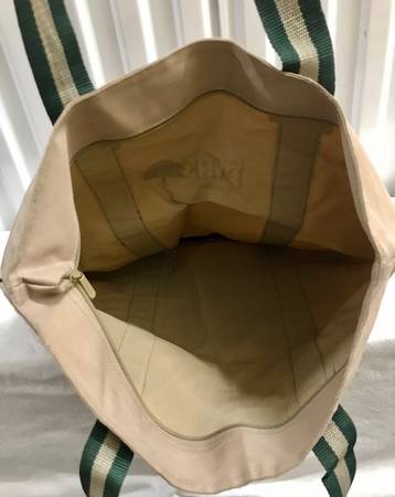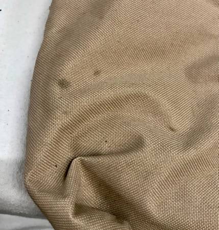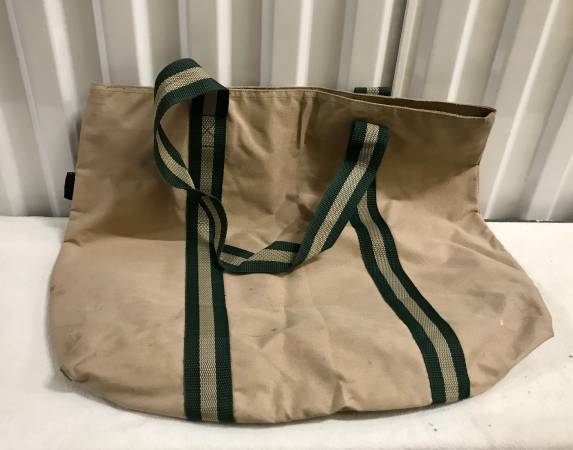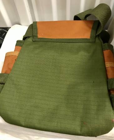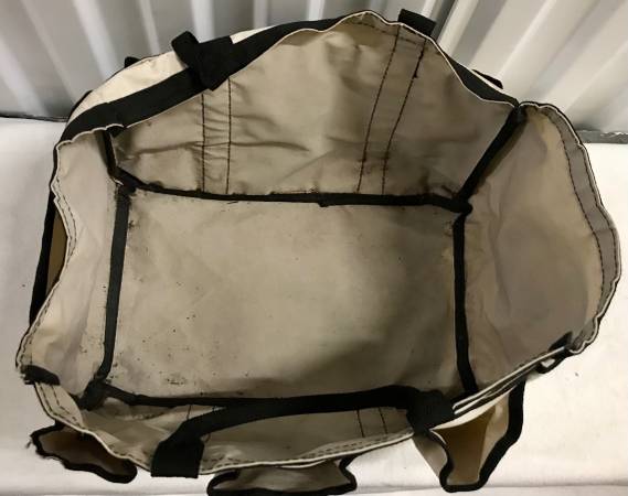 Condition: this one is in fair to good used condition. There is some fraying on the black trim on one of the pockets (see photos) and it is lightly stained in places.