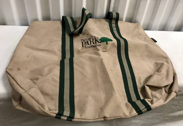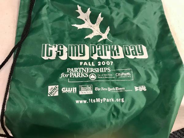 4 A green and white knapsack with black rope straps made of a synthetic material and featuring “It’s My Park Day /Fall 2007” with a leaf logo plus other info and sponsor logos. This one looks like it might be waterproof, making it work great for shopping or gym/pool/beach/rainy day items…