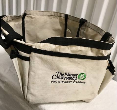 2. An off white and black canvas garden harvest vegetable and clippings tote with 6-7 outer tool/accessory pouches and pockets and a spacious inner area. It features a bright blue butterfly at one end and the Nature Conservancy logo at the other.