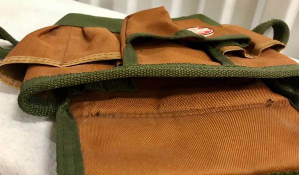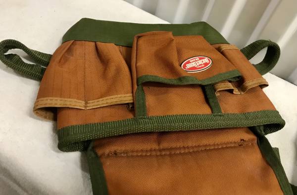 1. A newish rust and green colored canvas Bucketboss toolbelt handyman holster with 8+ pouches, loops and slots, including a wide inner pocket. It features an adjustable canvas strap and padding.