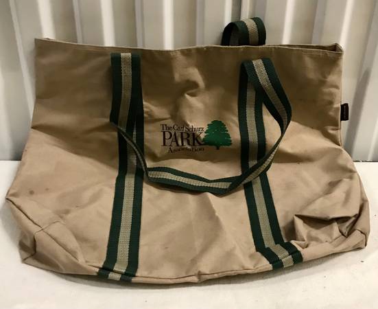 3. Large tan and green canvas shopping tote with “The Carl Shurz Association” and logo printed on one side.