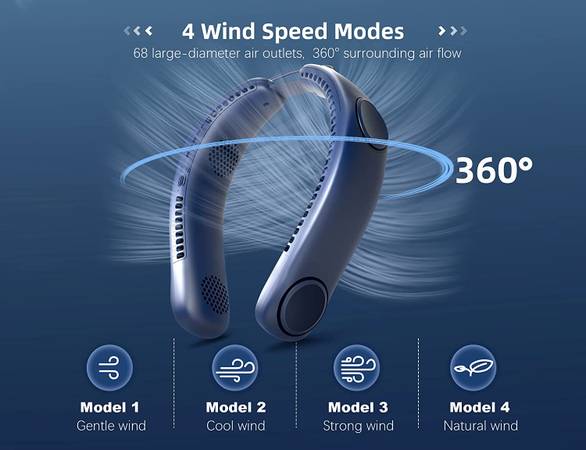 4 Fans Design: With the help of innovative four turbo fans and a total of 68 large-diameter air outlets, the neck fan increases the air volume by 100%, providing powerful and steady wind. Airflow comes out both upward and downward, which achieves rapid cooling of the neck and face