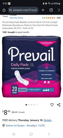 Prevail Feminine Menstrual daily Pads. Many in stock! They run $8.50 plus tax on Amazon, so Price is firm $3 per pack !!!! Text Only!