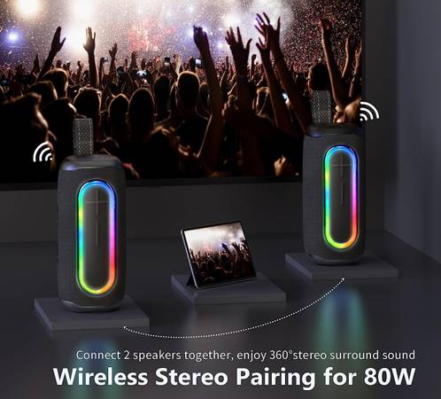 80W SUPER STEREO PAIRING -- Easy pairing of two portable Bluetooth speakers to create both left and right channel systems go crazy, the 80W ultra-stereo surround sound immediately invades your hearing, and your heart beats wildly with the double bass sound.