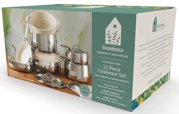 Bloomhouse 12 Piece Triply Stainless Steel Pots and Pans Cookware Set w/Non-Stick Non-Toxic Ceramic Interior and Ceramic Steamer Inserts, & 12 Protective Care Bags