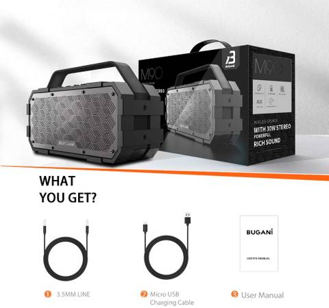 WHAT YOU GET: M90 Bluetooth speaker, Micro USB charging cable, AUX cable, Quick user guide