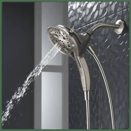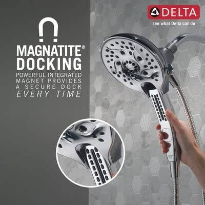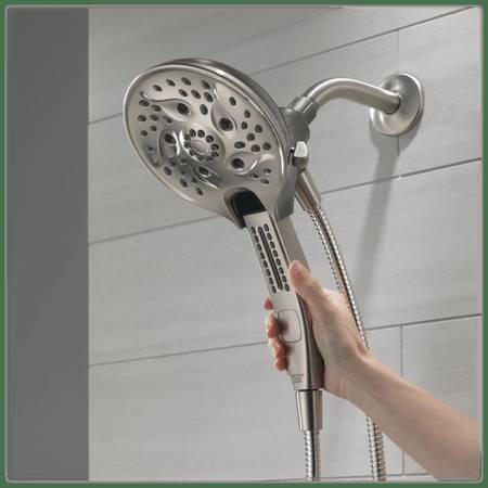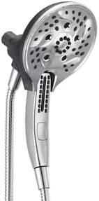 The Delta In2ition Shower head is a 2-in-1 shower head with a stationary wide-range spray ring and a removable shower head that slots into a center opening, allowing you multiple types of clean, even during the same shower session. This handy shower head boasts four different spray settings for a fully customizable clean, and its high-quality construction is built to resist corrosion and last long term.