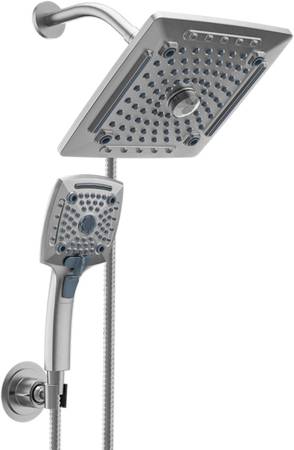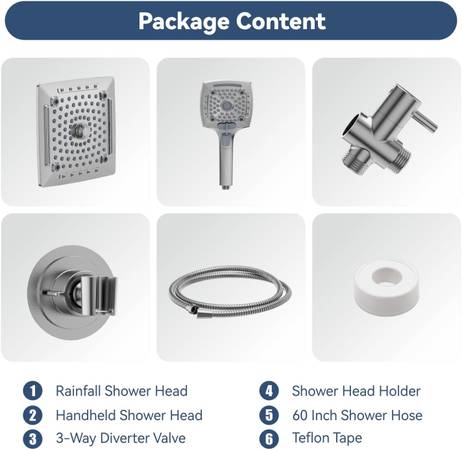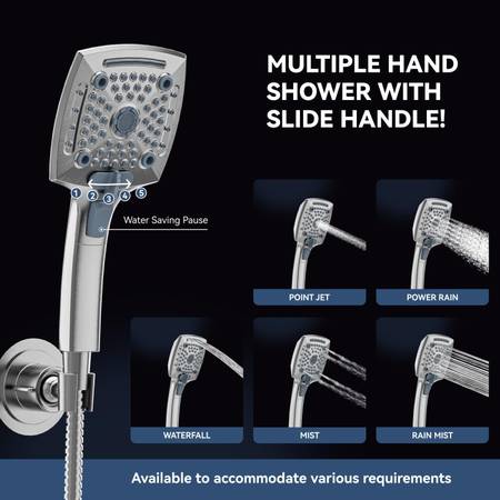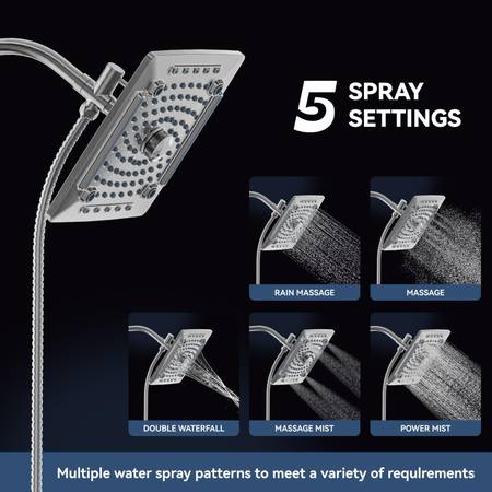 5 Settings Handheld Shower Head: This Handheld Shower Head has 5 spray modes to give you different showering experience and meet your multiple needs. Switch knob of the 3-way diverter to choose shower water follow out from only fixed shower head, only handheld shower head or both of them and enjoy a wonderful shower moment.
