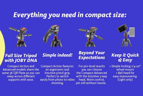 The JOBY Compact Action Tripod packs all the features of a full-size tripod in a small and versatile format designed with content creators in mind. Fully compatible with other JOBY tools and accessories, its 3.31 lb max load allows it to perform above its 2.56 lb weight rating. With a choice of a pistol grip, ball head, or an accurate 3-way head, this clever and capable tripod also features optional extras to accommodate mobile devices and action cameras, making it an ideal all-around solution to your content creation needs.