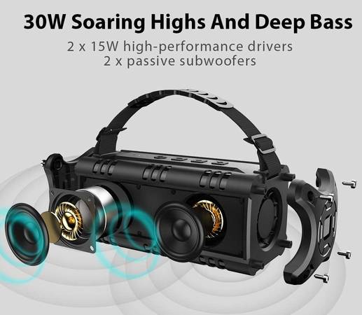 CRYSTAL CLEAR SOUND & DEEP BASS: Distinct mids and highs from our two precision acoustic drivers delivers excellent stereo sound and enhanced bass because of our proprietary passive bass radiator design, without distortion even at the highest volume. Providing 30% louder volume and richer bass than other speakers. The crystal clear deep bass 30W HD loud speaker is designed for both active outdoor and indoor use.