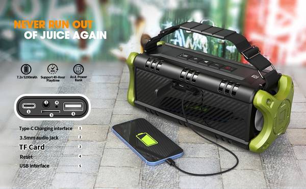 IPX6 Waterproof & 40H Playback & Power Bank Function - The outdoor speakers features IPX6 waterproof and shockproof mechanical casings which are suitable for outdoor activities. With a massive rechargeable battery, a single charge gives you enough juice to 40 hours of playtime. The Bluetooth speaker waterproof can also be a Power Bank to charge your smart device. Go with the Bluetooth speaker waterproof to launch your various adventures.