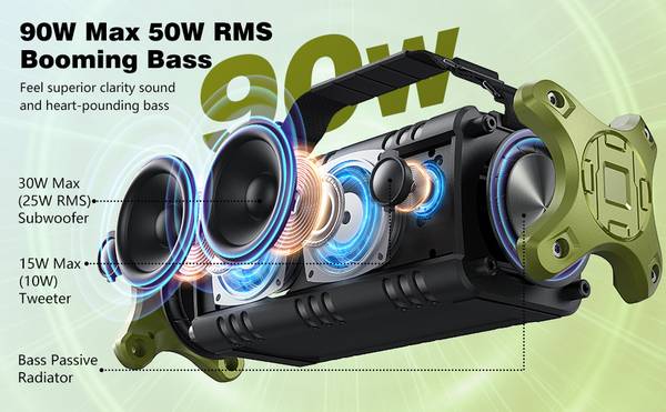 (90W Peak) 50W HD Sound With Punchy Bass - Get a portable Bluetooth speaker and the latest state-of-the-art 4 drivers and double passive bass radiators for producing punchy bass and true HD sound. And D8 portable Bluetooth speakers that directly protect passive radiators with Air Protective Covers from accidental drops. With the deep bass speakers Bluetooth wireless loud, you will feel best atmosphere for New Year’s Eve party, Christmas party, jobsite, gym and indoor & outdoor activities.