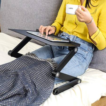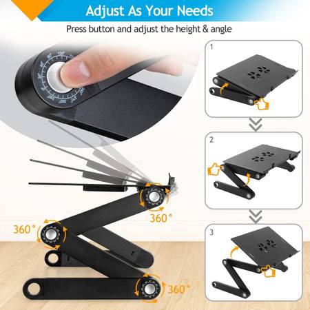 Adjust Any Angle: This Laptop Stand with adjustable auto-locking joints which are available for rotating around 360 degrees. It can hold things in a variety of configurations. The table will provide the most comfortable typing angle when you are sitting on the chair or lying down on the bed.