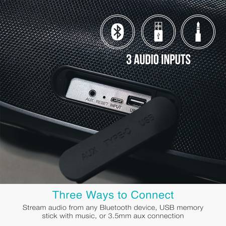 WATER RESISTANCE + MORE: IPX6 weather resistant design for protection from water and moisture, indoors and out; 3 AUDIO INPUTS let you stream audio from any Bluetooth device, USB memory stick with music, or 3.5mm aux connection; BUILT-IN SPEAKERPHONE with mic and Siri/Google Assistant support let you take calls and control your phone right from your partySPKR.
