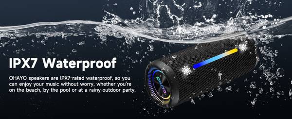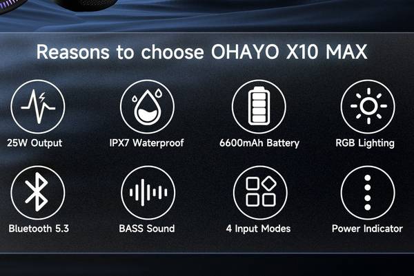 Take your tunes on the go with the powerful OHAYO X10 MAX. Our lightweight Bluetooth speaker goes anywhere. Bad weather? Not to worry. With its IPX7 waterproof design, you can rock out to our powerful sound rain or shine. Move more. Pair two OHAYO TWS-compatible speakers together for stereo sound to create a bigger party. Enjoy more than 24 hours of play time for your favorite music. Stand it vertical or horizontal and be bold with your choice of six lights vibrant colors