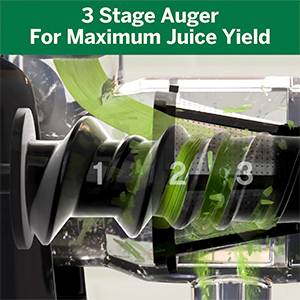 TRIPLE STAGE AUGER- The 3-stage augers produces a higher juice yield for more juice in your glass!