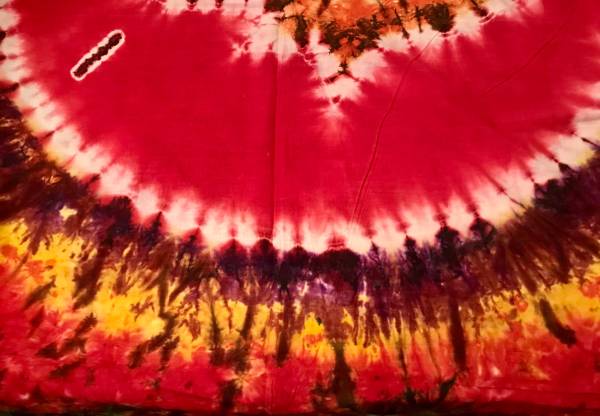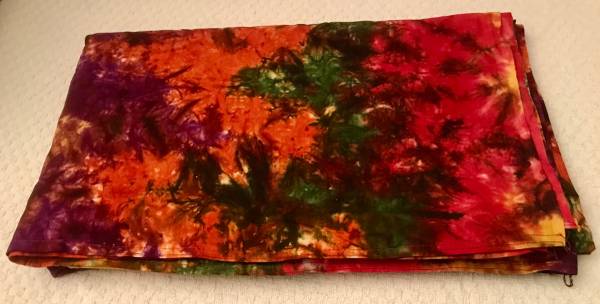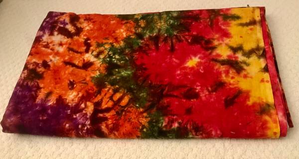 It features a colorful batik/tie-die pattern. A circular sunburst/tiedie-like pattern appears centrally and an abstract more batik-like pattern covers the rest of it. (I am not an expert and do not know what methods were actually used to produce the patterns.)