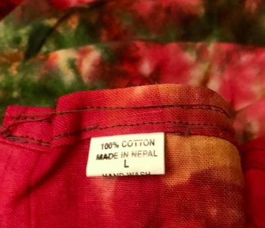It has a fabric/care label which reads “100% COTTON/ MADE IN NEPAL/ L/ HAND WASH SEPARATELY IN COLD WATER/ LINE DRY/ WARM IRON/ DO NOT USE BLEACH”. I’m not sure what the L represents — could this maybe also be worn as a sari?