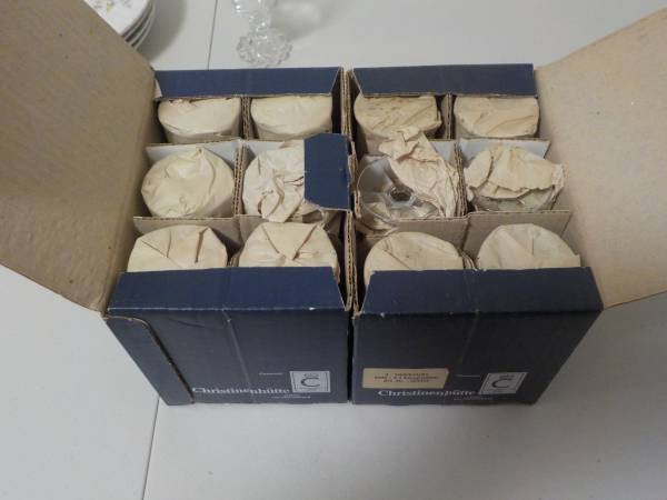 Two original boxes of 6 glasses,12 glasses total, still wrapped in original paper. $84.