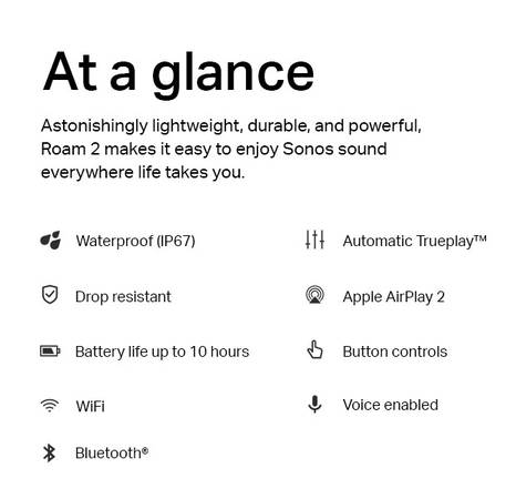 Astonishingly lightweight, durable, and powerful, Roam 2 makes it easy to enjoy Sonos sound everywhere life takes you. Just pair, play, and go. Enjoy up to 10 hours of size-defying clarity and bass. Fully IP67 waterproof and dustproof, Roam 2 is ready for the outdoors. Plus, it doubles as a smart speaker at home.