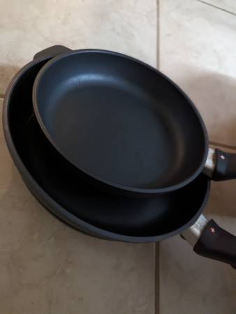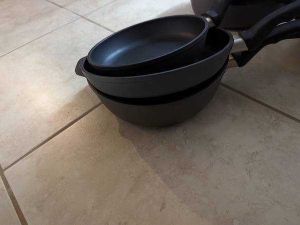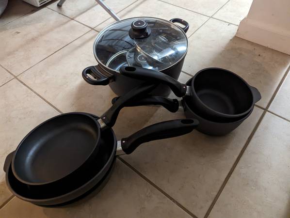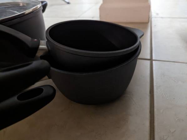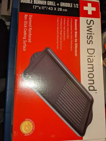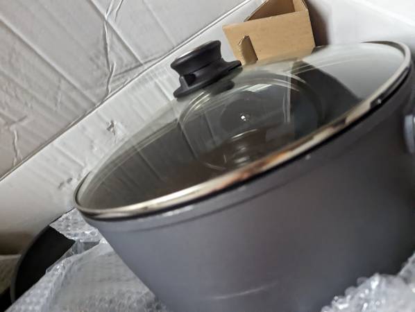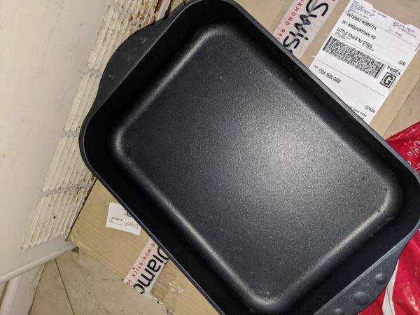 The Grille + Griddle Combo & Roasting Pan are unused with original boxes. The 10-piece cookware set is lightly used in great condition. The pans/pots themselves show no markings - you could only tell they were used from staining on the bottoms.