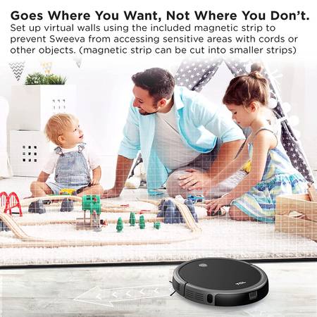 Goes Where You Want, Not Where You Don’t: Sweeva lets you customize where it cleans. Simply set up virtual walls using the included magnetic strip to prevent Sweeva from accessing sensitive areas with cords or other objects. (magnetic strip can be cut into smaller strips to fit your needs)