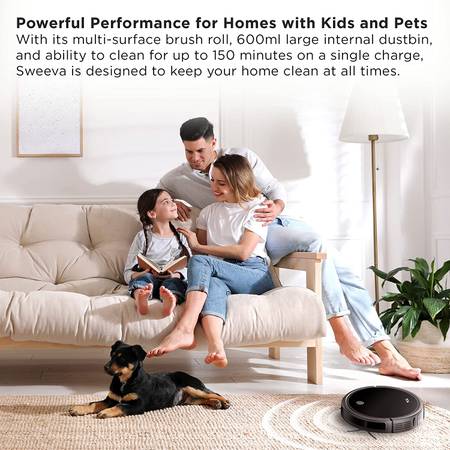 Powerful Performance for Homes with Pets: With its multi-surface brush roll, large internal dustbin of 600ml, and ability to clean for up to 150 minutes on a single charge, Sweeva has the deep-cleaning power to tackle large and small debris, and pet hair.