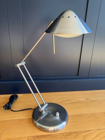 A 1990s postmodern desk lamp by Tensor. The lamp is primarily silver and color with gold tone accents. The angular shade and body can be adjusted and a Tensor sticker is present on the underside....