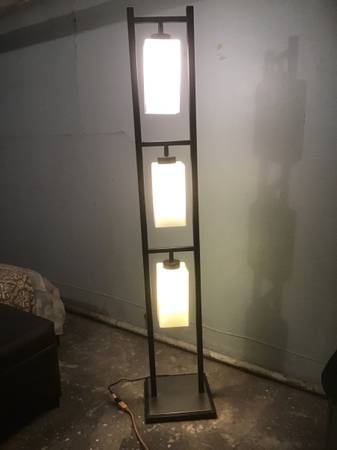 Metal and glass, heavy, 66” high. The base is steel or chrome 12”x12”. The individual glass shades are 10”x 5”x5”. The shades swivel slightly up and down. The cord is 21” long and it doesn’t have...