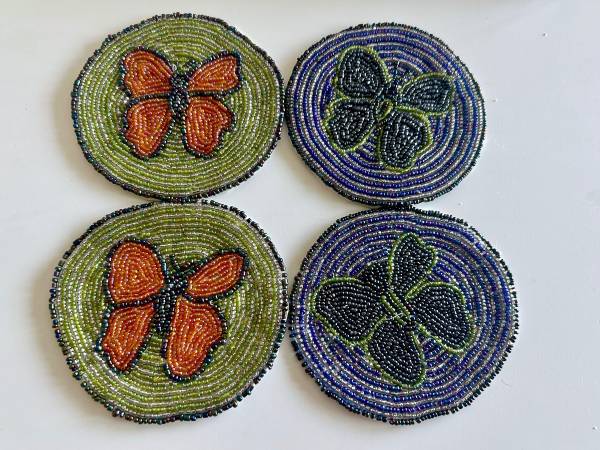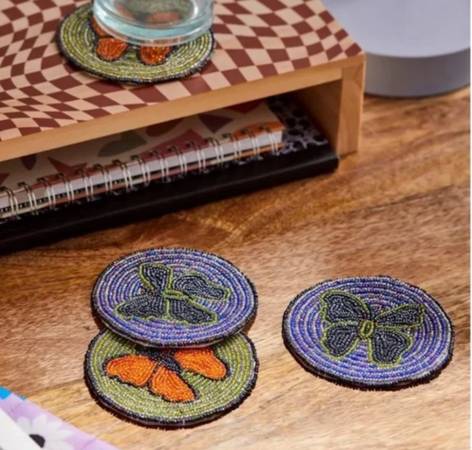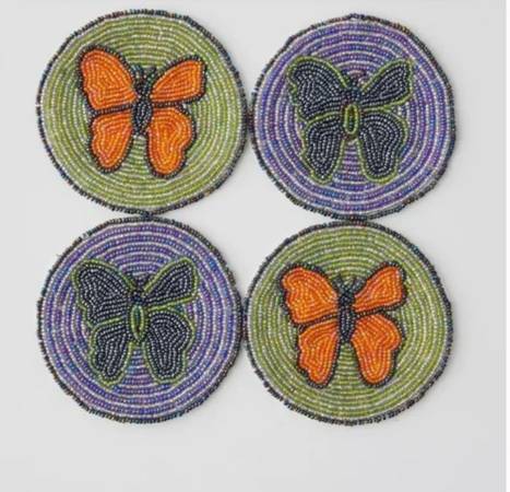 Protect surfaces and add some pretty textures to your space with a set of four beaded coasters. Perfect for adding a vibrant touch to your dining or coffee tables, these coasters are crafted from glass beads and are complete with butterfly designs to the centre.