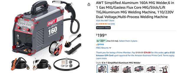 Brand new, never used. Bought for $200 AWT Simplified Aluminum 160A MIG Welder,6 in 1 Gas MIG/Gasless Flux Core MIG/Stick/Lift TIG/Aluminum MIG Welding Machine, 110/220V Dual Voltage,Multi-Process...