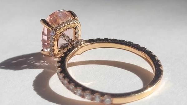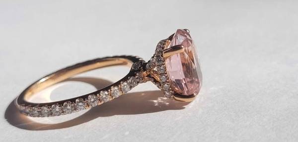 Hi! This is a beautiful 18k rose gold engagement ring with a 3.25 carat pink tourmaline as the main stone and approximately 0.67 carats total weight of colorless natural diamonds. These diamonds are excellent cut, excellent symmetry and excellent polish, running along the shoulders and of course the hidden halo. The diamonds are F to G color and VS+ clarity. It is a size 6/6.5 and is resizable. I hate having to sell this but it didn't work out. We will meet at a police station or you buy through Zelle. Willing to work on price but nothing crazy low.