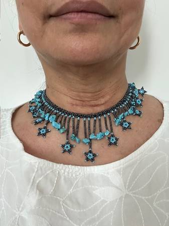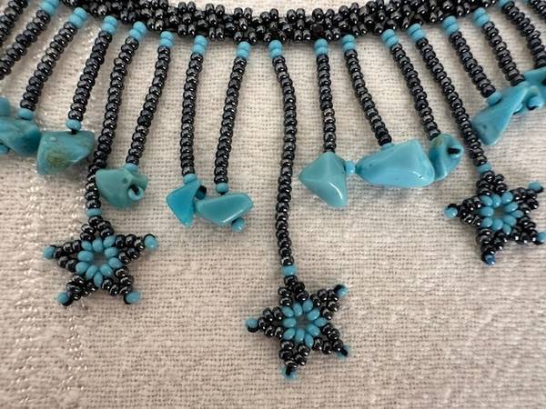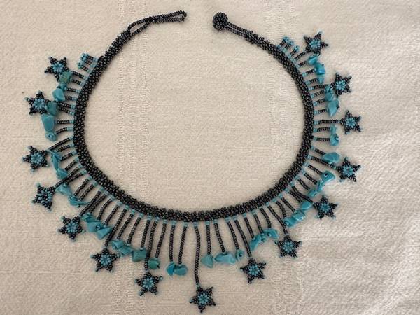 This necklace required a lot of work due to its intricate design. It's hard to find this level of craftsmanship anymore. I bought it at a crafts fair and it was the only one of its kind. It is in excellent condition, no missing beads, no gaps, no sagging. Sadly, I have to let go as it is no longer age-appropriate for me.