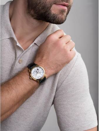 From the Sutton Collection, this men’s Bulova timepiece delivers sophisticated style. The refined gold-tone case with a blend of brushing and polishing features a domed mineral crystal. The 21-jewel movement is visible through the double on-dial aperture and exhibition caseback. The elegant silver-white dial features gold-printed roman numerals, a 24-hour subdial, and a 60-minute chronograph counter. Perfectly paired with a black alligator grain leather strap with a double-press deployant closure. This Bulova men’s timepiece from the Sutton Collection will have you looking your best for every occasion.